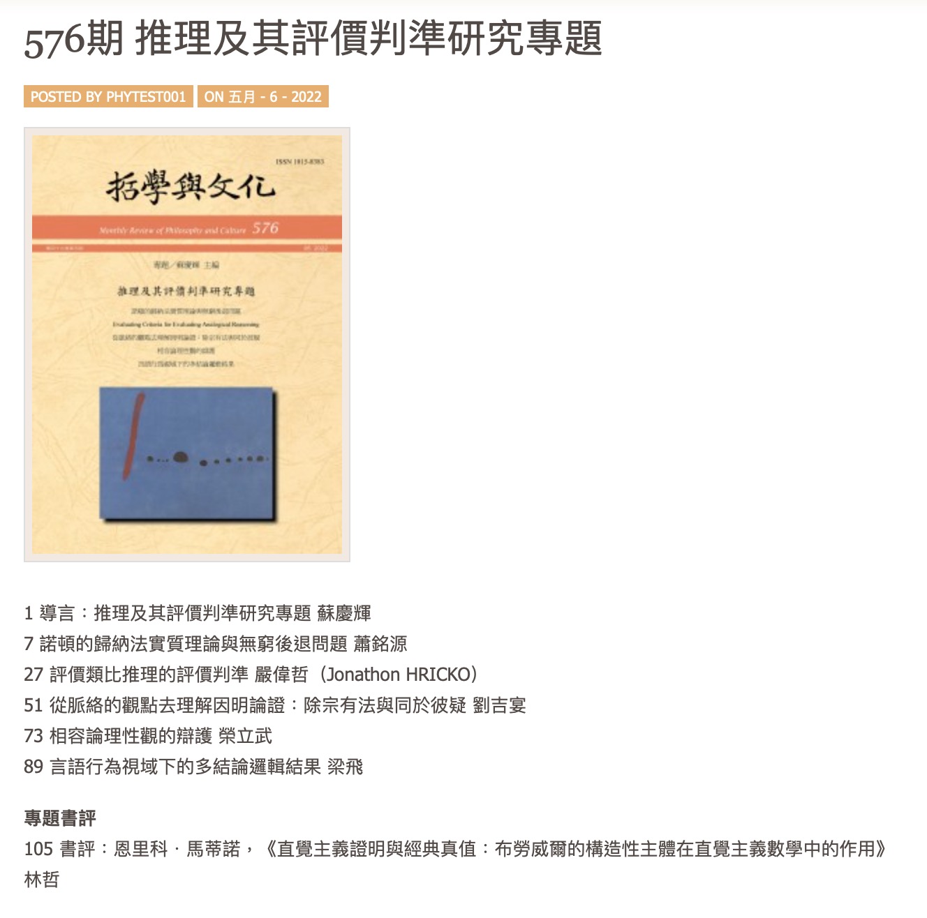 苏庆辉教授担任《哲学与文化月刊》专题主编,以“推理及其评价判准”为研究主题,出版5篇专题论文和1篇专题书评(见《哲学与文化月刊》2022年5月,总第576期),其中包括我院荣立武副教授为独立作者的“相容论理性观的辩护”和梁飞副研究员为独立作者的“言语行为视域下的多结论逻辑结果”两篇研究性文章,苏庆辉教授为专题撰写了导言。