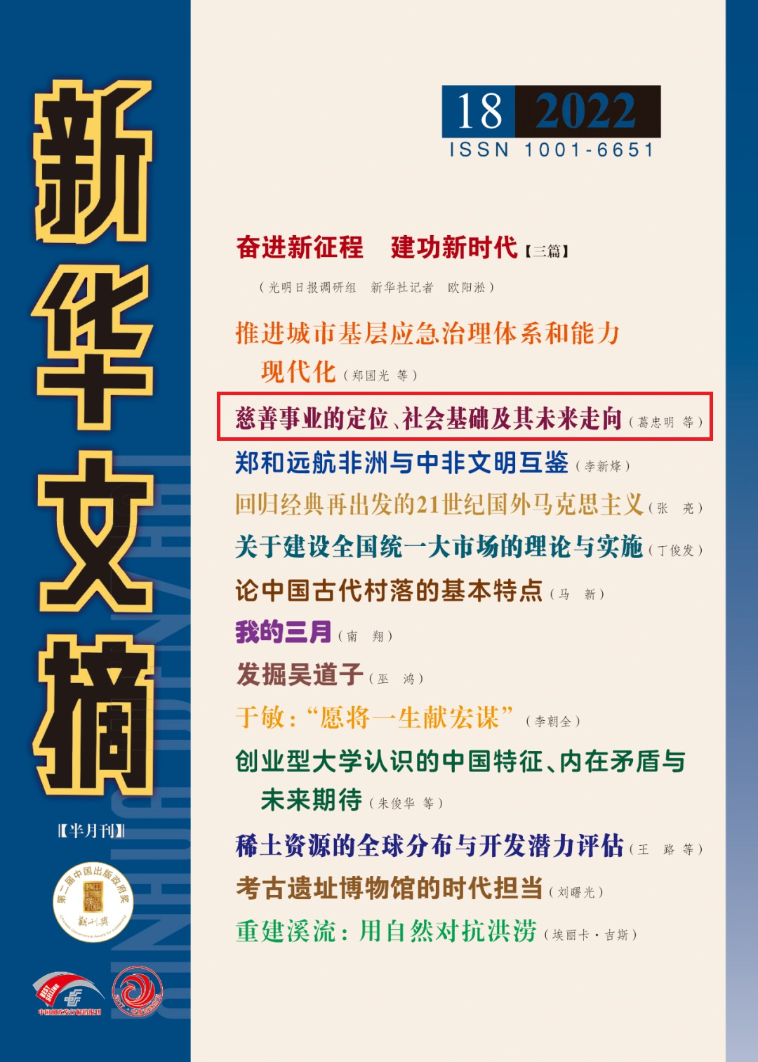 葛忠明《慈善事业的定位、社会基础及其未来走向》一文被《新华文摘》作为封面文章全文转载