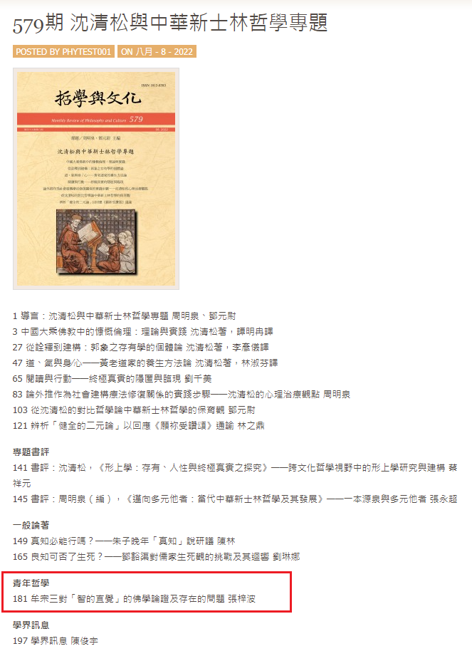 2017级博士研究生张梓波在《哲学与文化》期刊青年哲学板块发表文章“牟宗三对‘智的哲学’的佛学论证及存在的问题”。