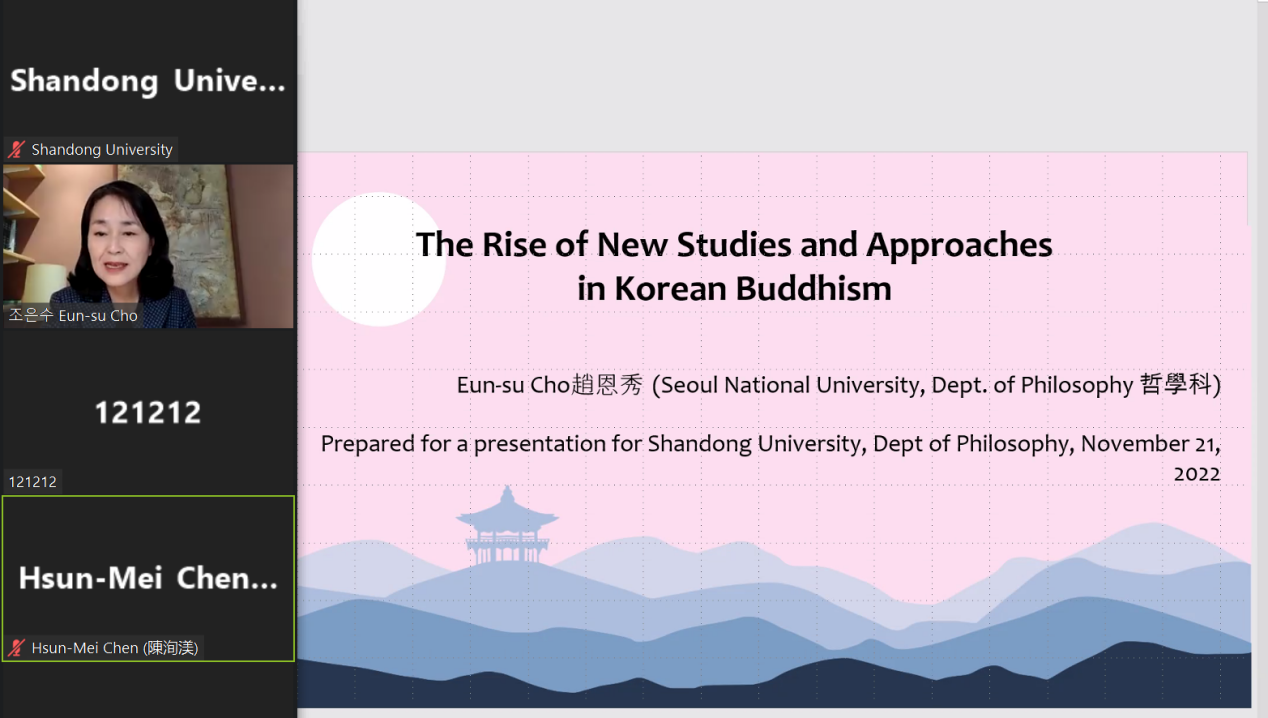 11月21日,韩国首尔国立大的赵恩秀教授做客“望岳海外名家讲坛(第8期)”,给我院师生带来一场题为“The Rise of New Studies and Approaches in Korean Buddhism(韩国佛教新研究和新方法的兴起)”的讲座。讲座由我院王文方老师主持,由京都大学哲学系博士候选人陈洵美担任评论人。