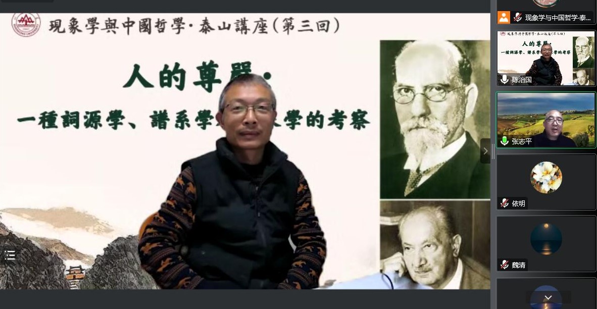 2022年12月23日晚上,taptap点点官方网站现象学与中国文化研究中心、taptap点点官方网站举办“现象学与中国哲学”泰山讲座(第三回)。本次讲座采取线上视频会议形式,邀请上海师范大学张志平教授做学术报告,报告题目是“人的尊严:一种词源学、谱系学和现象学的考察”。讲座由陈治国教授主持。