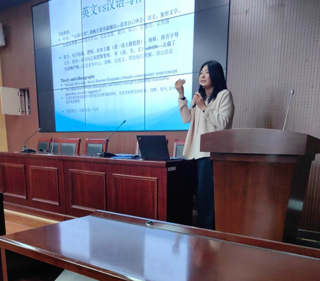 讲座伊始,杨洁老师首先简要介绍了国外学界论文发展的生态,并介绍了论文发表存在着包含修改在内的几个阶段。接下来,杨洁老师谈论了英文写作和汉语写作的差异:中文写作具有委婉含蓄的特征,留给读者自行体会,而英文则直截了当、清晰严格。关于人类学论文的写作,杨洁老师提到,我们并非在现存理论框架中填充新的田野调查材料,而是用新鲜的材料来调整、批判、延伸现有的理论框架。