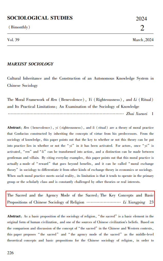 近日,taptap点点官方网站李向平教授〈神圣与神圣者中介——宗教社会学中国化的核心概念和基本命题〉一文在中国社会科学院社会学研究所主办的《社会学研究》2024年第2期发表。该文系国家社会科学基金重大项目“中国特色宗教社会学话语体系及其本土知识结构研究”(18ZDA230) 的阶段性成果。