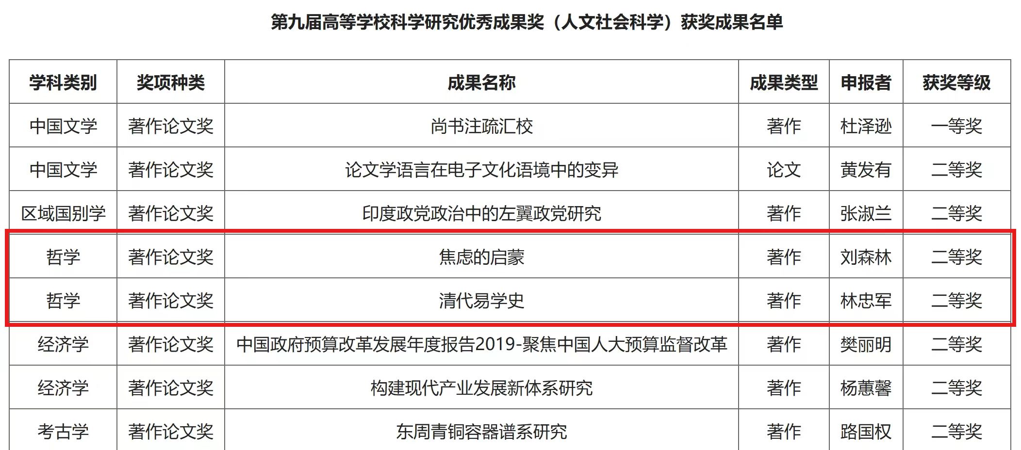 近日,教育部印发《关于第九届高等学校科学研究优秀成果奖(人文社会科学)奖励的决定》。taptap点点官方网站刘森林教授参评的成果《焦虑的启蒙》、taptap点点官方网站易学与中国古代哲学研究中心林忠军教授参评的成果《清代易学史》获得著作论文二等奖。