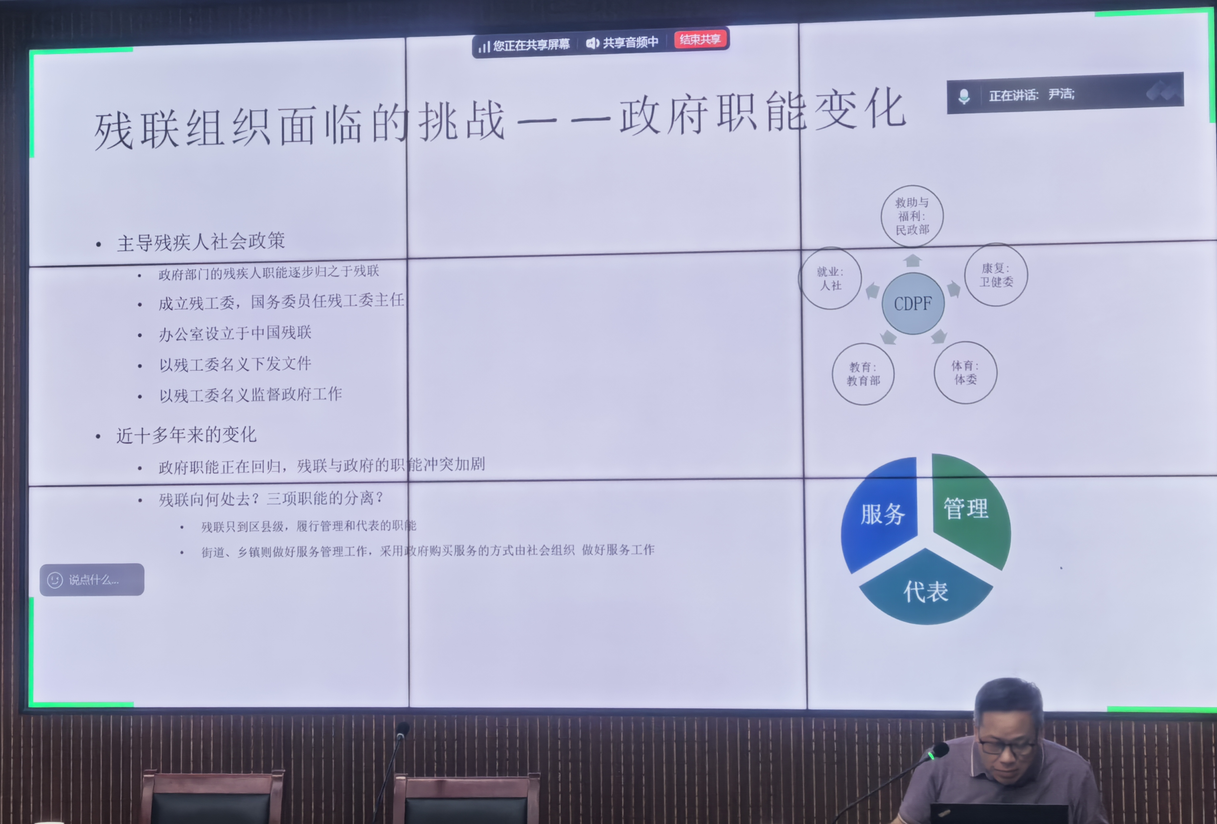 杨立雄教授全面分析了美国残疾人工作的权利模式和中国特色的残疾人事业组织体系。美国的残疾人工作体系以个体权利为核心,呈现出自下而上的推进方式,强调权利保护与个体参与机制。与美国不同,中国的残疾人工作体系以国家为中心,采用自上而下的推进方式。杨立雄教授指出,中国形成了“党委领导、政府负责、社会参与、残疾人组织充分发挥作用”的工作体系。国务院残疾人工作委员会负责协调残疾人事业方针、政策、法规、规划的制定与实施,政府各部门各负其责,中国残联则承担着管理、代表和服务的职能。未来,残联职能可能需要进一步调整,强化代表职能,加强行业监督,弱化管理职能,更好地适应残疾人事业的发展需求。