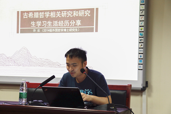 许欢博士介绍了哲学文本的三个面向。第一个面向是文本本身,即关注文本直接呈现的内容,对这些文本语言的把握是我们形成直接理解的关键。文本的不完整性是文本本身难以克服的障碍,但这种不完整性并意味着文本的“无意义”,他给我们带来挑战的同时也给了我们重建视域的机会。第二个面向是“作者-思想”的二元结构,即作者与思想间映射的建立。古代文本的文体具有多样性,如苏格拉底的对话体、亚里士多德的讲课体等。而作者和思想的复数性也给这一面向带来了困难。第三个面向是“作者-思想-历史”三元结构,即考虑文本表面张力与文本的时间性。哲学文本三个面向的关系不是相互割裂的,而是统一于文本当中,在实践中我们通常会采用便利性原则,即只注意到文本的某个面向。随后许欢博士还介绍了自己的研究生生活,他提到,自己曾为了研究古希腊哲学到欧洲旅游,参观古希腊哲学遗址。互动环节,同学们提出了研究生学习和生活如何平衡等问题,许欢博士一一解答。他的分享幽默风趣,令同学们获益良多。