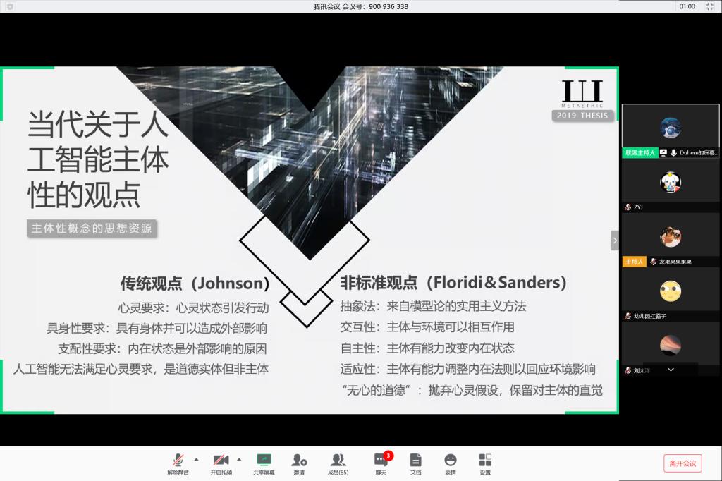 互动环节中,同学们通过线上语音交流的方式就讲座内容展开了积极的探讨。探讨中涌现了许多新问题,诸如“人工智能作为人类的创造物,独立承担道德责任是否合理”、“现实中有没有标准的道德准则”。吴童立一一与发言同学们进行讨论,并鼓励同学们在讲座结束后对相关问题继续探讨。
