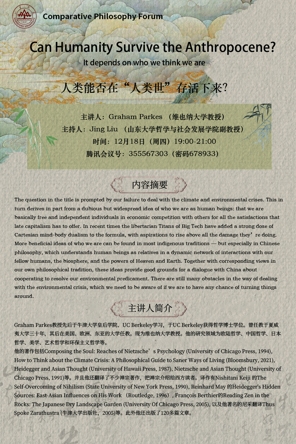 Graham Parkes教授先后于牛津大学皇后学院、UC Berkeley学习,于UC Berkeley获得哲学博士学位。曾任教于夏威夷大学三十年,其后在美国、欧洲、东亚的大学任教。现为维也纳大学教授。他的研究领域为欧陆哲学、中国哲学、日本哲学、美学、艺术哲学和环保主义哲学等。
