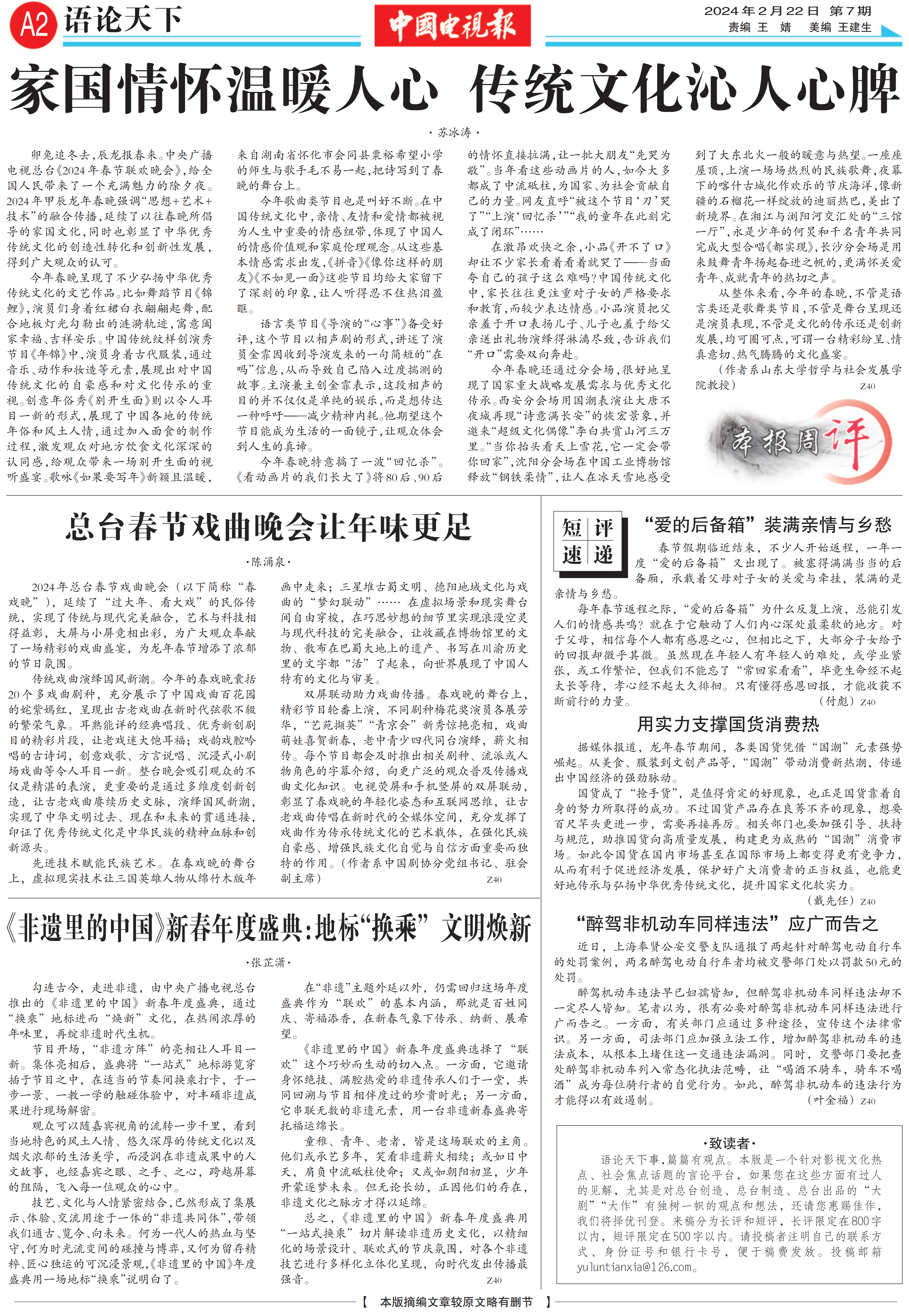 苏冰涛教授在《中国电视报》发表评论文章:“家国情怀温暖人心 传统文化沁人心脾”