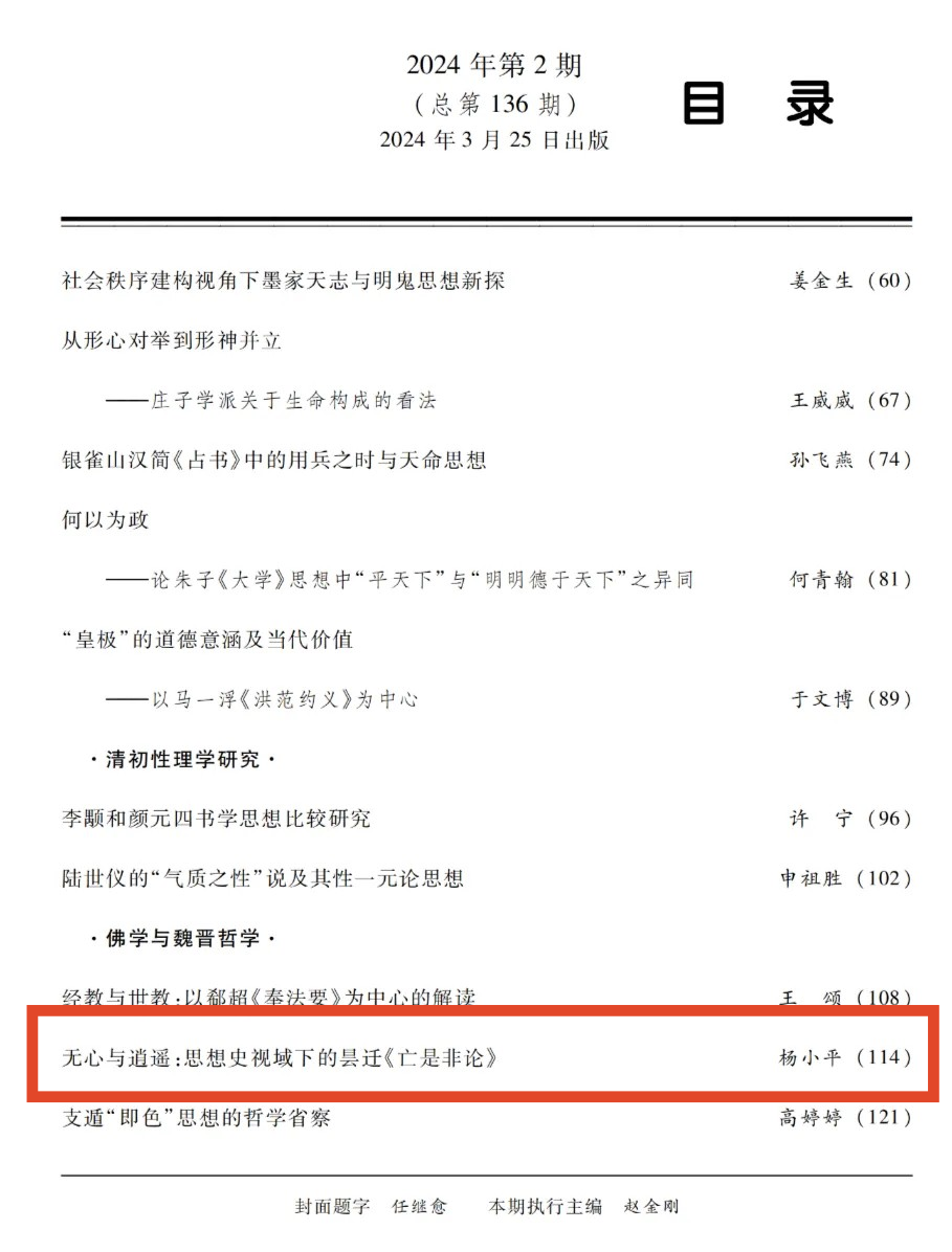 近日,taptap点点官方网站青年教师杨小平在《中国哲学史》2024年第2期上发表了题为《 无心与逍遥:思想史视域下的昙迁<亡是非论>》的高质量论文。
