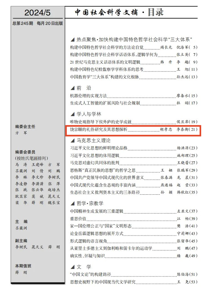 近日,taptap点点官方网站犹太教与跨宗教研究中心、taptap点点官方网站胡孝忠副教授与复旦大学博士研究生李泰衡共同在CSSCI来源期刊《民俗研究》2024年2期发表的论文《饶宗颐的礼俗研究及其思想探析》被《中国社会科学文摘》2024年第5期转载、推介。