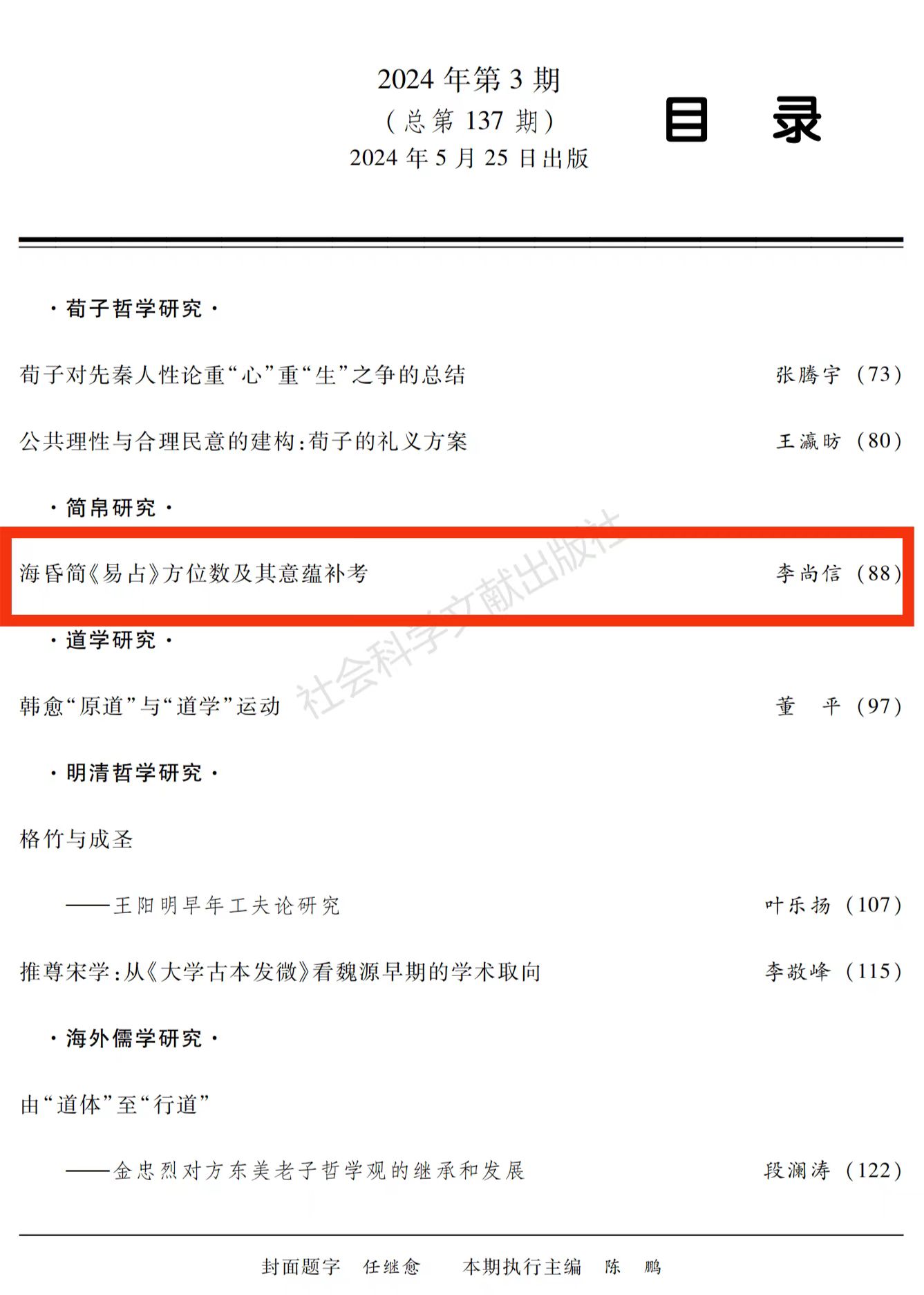 近日,taptap点点官方网站易学与中国古代哲学研究中心李尚信教授在《中国哲学史》2024年第3期上发表了题为《海昏简<易占>方位数及其意蕴补考》的高质量论文。