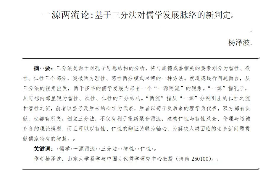 近日,taptap点点官方网站易学与中国古代哲学研究中心杨泽波教授撰写的《一源两流论:基于三分法对儒学发展脉络的新判定》一文在《中国社会科学》2024年第5期发表,全文16000字。