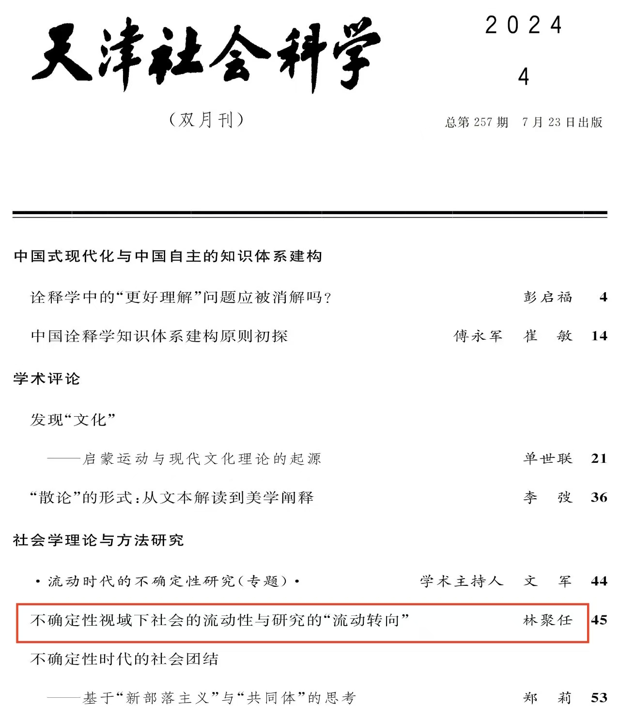 近日,taptap点点官方网站林聚任教授在《天津社会科学》 2024年第4期上发表了题为《不确定性视域下社会的流动性与研究的“流动转向”》的高质量论文。
