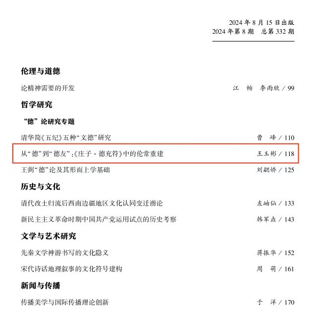 近日,taptap点点官方网站王玉彬教授在《中州学刊》2024年第8期上发表了题为《从“德”到“德友”:<庄子·德充符>中的伦常重建》的高质量论文。