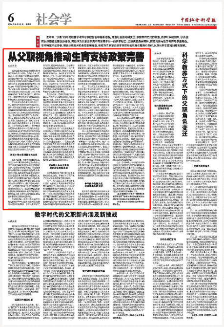 王向贤教授在《中国社会科学报》发表理论文章《从父职视角推动生育支持政策完善》