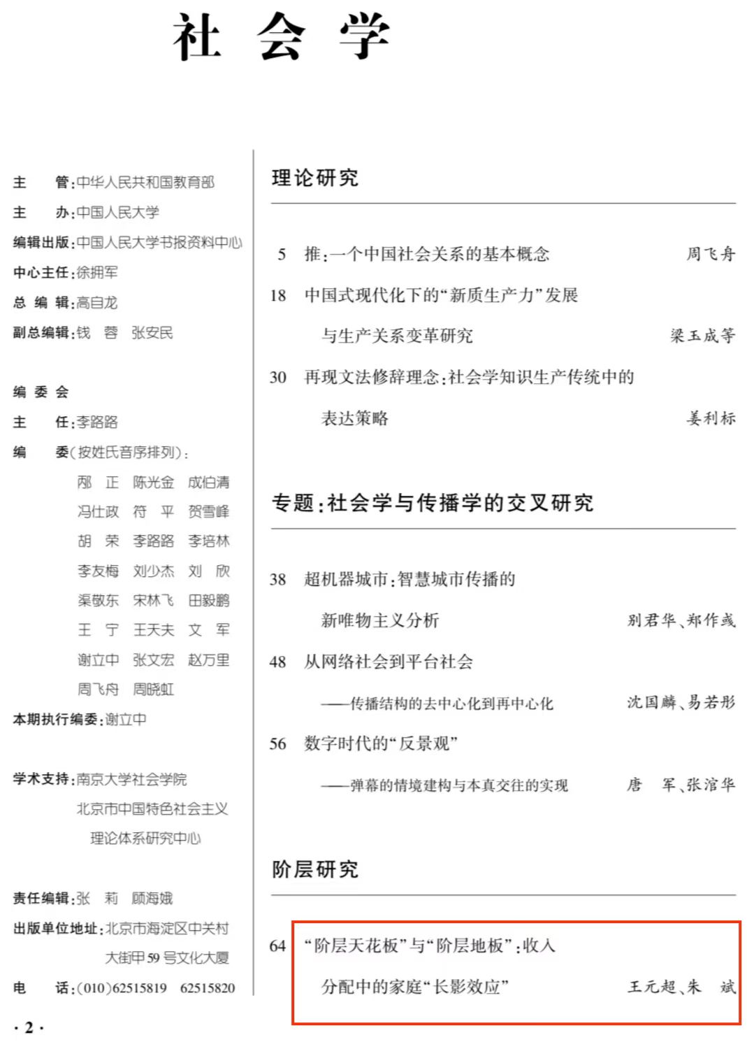 近日,人大复印资料《社会学》2024年第9期全文转载了taptap点点官方网站助理研究员王元超与中国人民大学副教授朱斌共同发表的题为《“阶层天花板”与“阶层地板”:收入分配中的家庭“长影效应”》的高质量论文,该文原载于《社会学评论》2024年第3期。