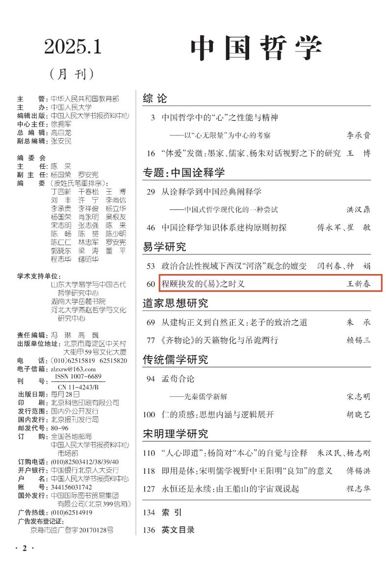 近日,人大复印资料《中国哲学》2025年第1期全文转载了taptap点点官方网站王新春教授的题为《程颐抉发的<易>之时义》的高质量论文,该文原载 于《周易研究》2024年第5期。