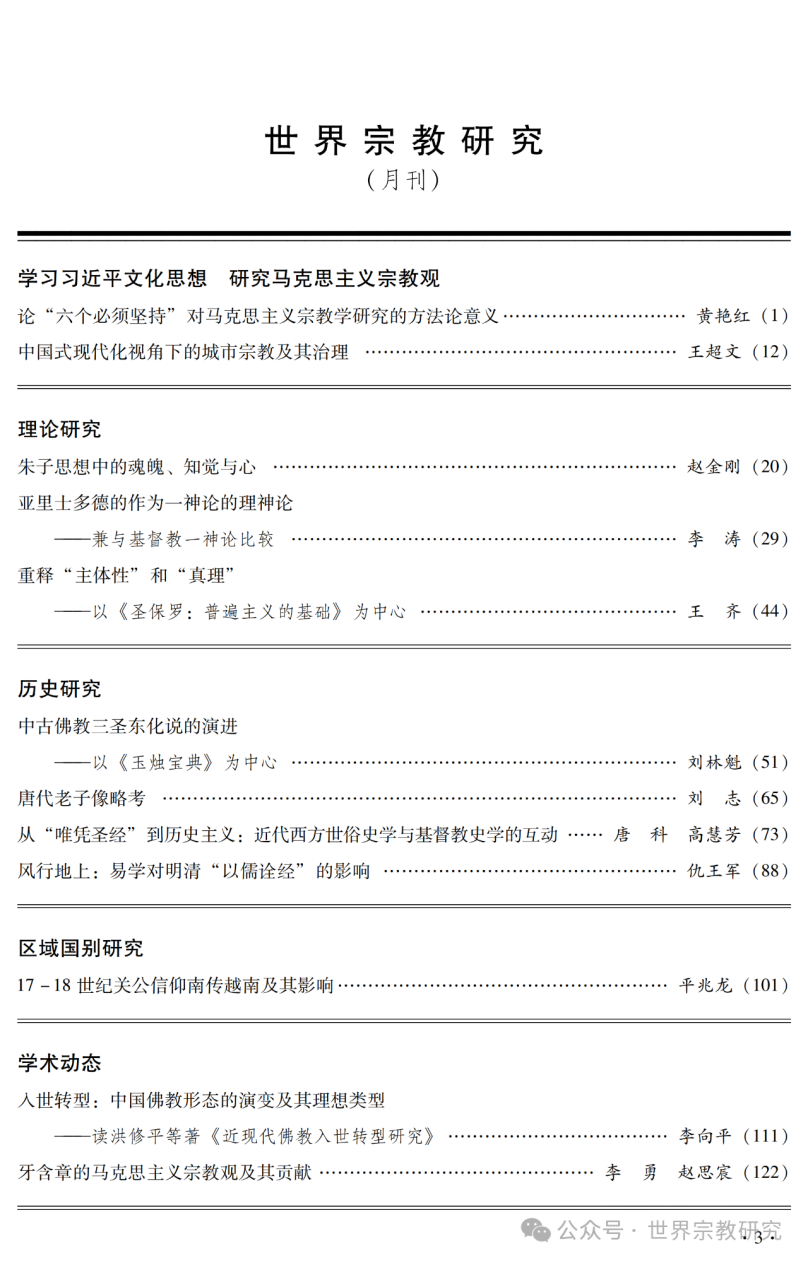 《世界宗教研究》是中国社会科学院世界宗教研究所在国内首创的宗教学专业学术刊物,迄今已有40余年历史,许多国内外有成就的学者都在此发表过质量精到的文章,影响了一代代学人。被全国各大学列入中文“核心期刊”,国外学术界将其推选为中国社会科学界“十大刊物”之一。 其以“学术性、理论性”为宗旨,辟有“宗教学理论研究”“佛教研究”“道教研究”“基督教研究”“伊斯兰教研究”“民间宗教研究”“少数民族宗教研究”“儒教研究”“当代宗教研究”“海外论坛”“学术动态”“书刊评论”等各种特色栏目。