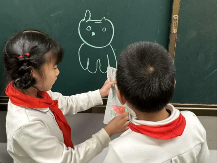 接下来是“每人一笔”游戏。志愿者根据分组提供指定词汇,由学生们共同创作画作。在志愿者的引导下,各小组进行了充分的讨论与交流。每组学生依次到黑板前,以接力的方式为本组的词语绘制形象。志愿者逐一展示学生们合力完成的作品,学生们积极举手分享自己的活动感受。