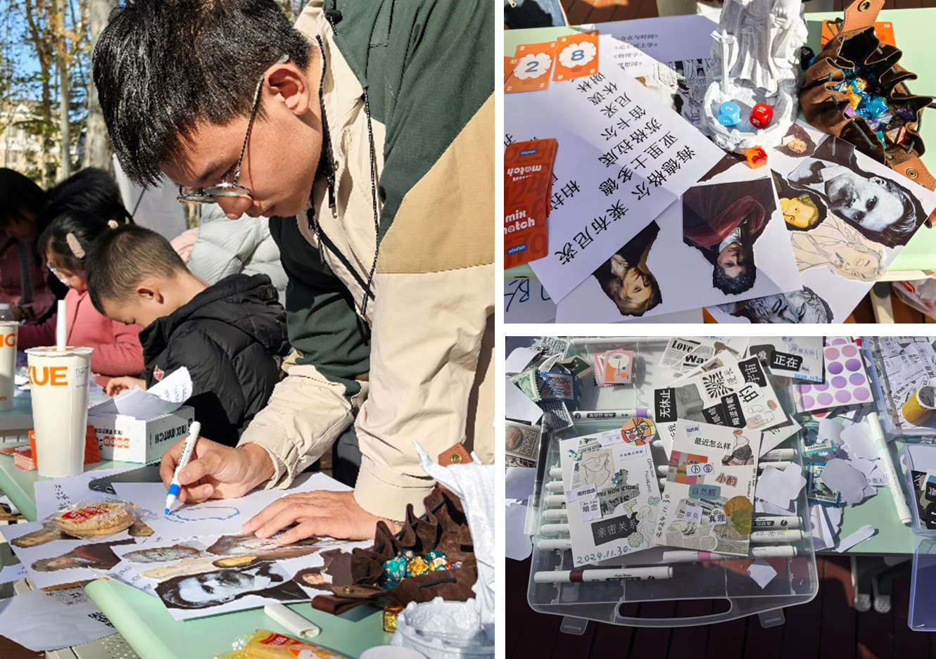 游园会现场由“哲学圈套”、“拼贴诗歌”、“膜法留言”、“哲思片语树叶贴”、“哲学大冒险”六大交互式展台为依托,有机整合多元趣味活动形式。面向全校师生和游客开放的展板与游戏,吸引了来自从理到工、由文至医各院系的数百名师生开展深度参与和交流:来校游学的小朋友们在“哲学圈套”活动区域投掷圈环、搏得声声喝彩;参与者们在“拼贴诗歌”展台以精美的手工艺品抒发心中感怀;在“膜法留言”和“哲思片语树叶贴”展台,师生信笔写下对未来的期盼、对哲学的思考;在“哲学大冒险”体验区域,人群摩肩接踵、笑声频频。兼具知识性、交互性与趣味性的活动异彩纷呈,为师生搭筑了一个以具身实践、双向互动了解哲学专业知识的平台。