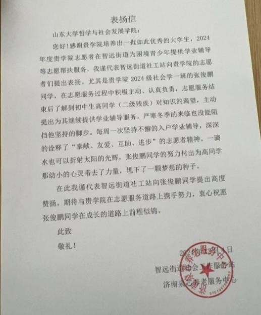 近日,taptap点点官方网站收到一封来自智远街道社会工作服务站的表扬信,信中对学院 2024 级社会学一班张俊鹏在志愿服务中的突出表现给予高度赞扬,同时对学院在人才培养方面的成果表示肯定。