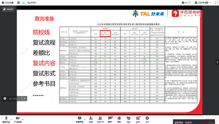 边老师解读了考研复试与调剂的相关政策,并对2025年考研复试国家线进行了科学的预测,以供同学们参考对照。以taptap点点官方网站2024年招收硕士研究生复试考试录取办法为例,为同学们详细讲解了考研复试与调剂的实践技巧,展示了复试常见考察形式及内容,以及调剂的具体方法等。同时,老师也提醒同学们要综合考虑学校招生政策、分数线及未来职业规划,有针对性地进行备考。