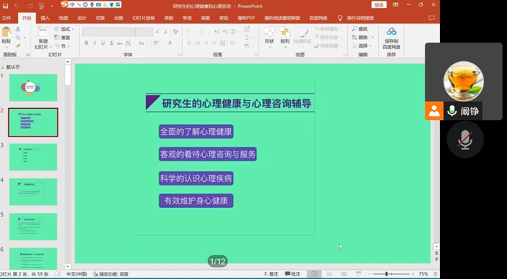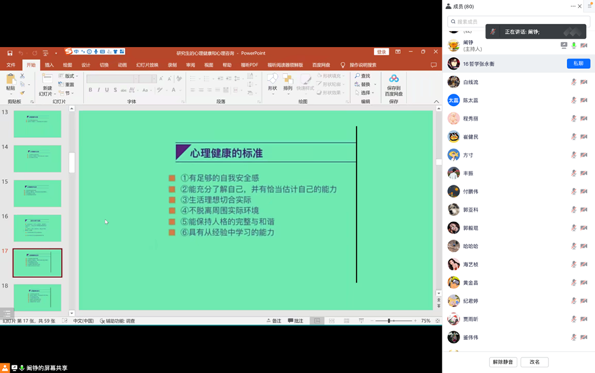阚铮以研究生所处的特殊人生阶段展开论述,剖析了研究生群体面临的来自就业、学业和情感等多方压力,引起同学们对于心理健康重要性的思考,而后从“全面的了解心理健康、客观看待心理咨询和服务、科学认识心理疾病、有效维护身心健康”四个方面层层深入,帮助同学们更客观地觉察、评估自身心理健康状况,指引同学们更科学有效地预防、舒缓潜在的心理问题。