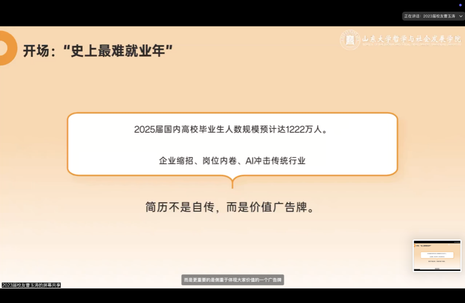 曹玉涛从自身求职经历切入,给出企业求职的经验建议,并结合当前就业形势,鼓励同学们主动了解企业前景和成长路径,通过多种方式突破就业困境。他指出,要在完善简历的基础上提高网投效率,在一次次面试中“练兵”,总结经验,提升能力。