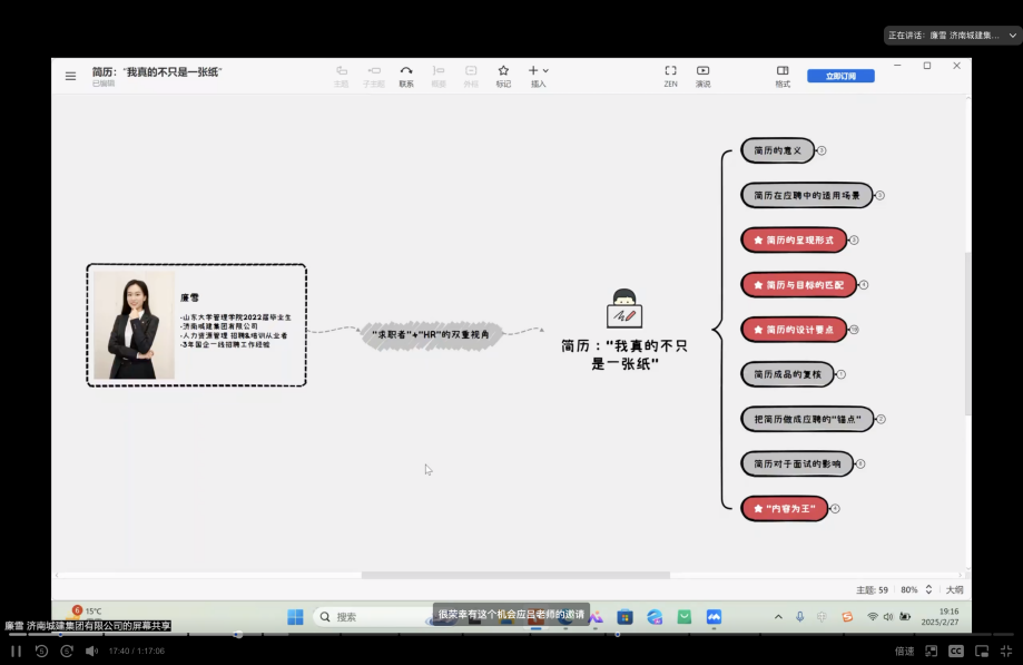 廉雪结合个人人力资源领域的工作实际,以求职者和HR的双重视角介绍简历设计的注意事项和要点。她强调,简历是个人综合素质的凝练与映照,更是对自身学生时代的复盘与梳理。求职者需要在深思熟虑、系统评估的基础上进行简历制作,着重展现自身的核心竞争力与长足的积累,牢记“内容为王”。随后,廉雪对“勇往‘职’前”第三届简历设计大赛的两份获奖作品进行了点评并给出建议。