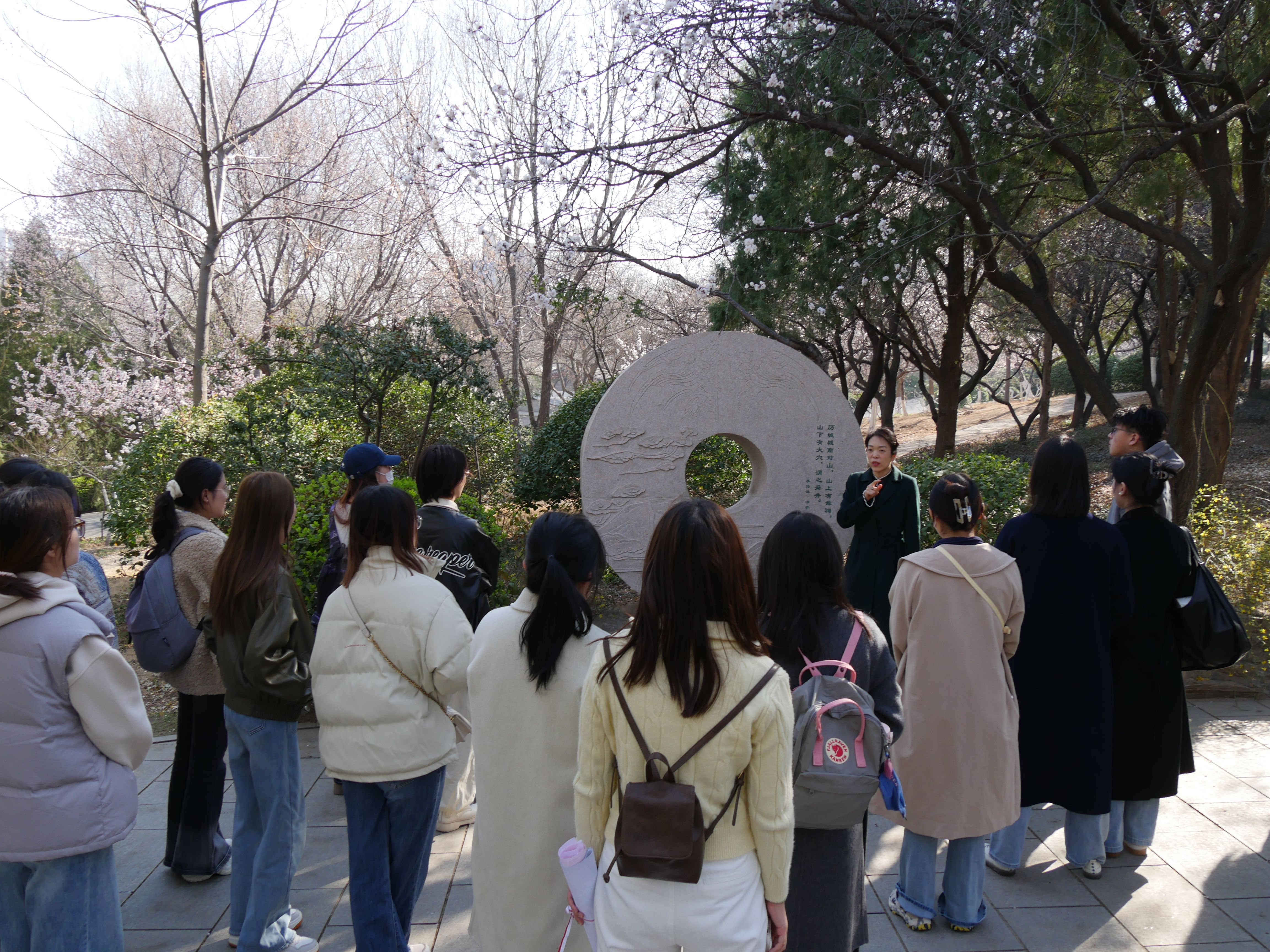 在舜文化主题研学环节,陶丽丽带领大家开展舜文化研学路线游学,先后参观尧帝访贤、历山溯源、舜耕历山等文化景观,探讨学习了经典背后的文化内涵与舜帝美德,系统领悟了“德孝仁和”的舜文化精髓。最后,研学队伍在大舜石窟园系统回顾了舜的经典故事,在“象耕鸟耘”等传说场景还原中,深入探讨舜帝“以德治国、和合共生”的价值理念,深刻理解了新时代德治思想的渊源及其对现代社会治理的启示。
