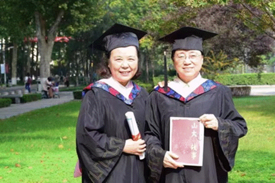 2017年10月,为纪念七七级学生高考40周年,山大几位热心同学在中心校区举办了“梦圆山大”庆祝活动,我与小翟与班级几位同学一起参加了。在近200人的庆祝会上我们都十分感慨和激动,感慨国家高等教育的快速发展,感慨大家命运的根本改变,当然也打心底庆幸大家成为了永远的同学和朋友。庆祝活动两天过后,小翟电话问我能否借到学位服,我说:“没问题,来吧。”于是在母校的大门前、图书馆、小树林都留下了我们身穿学位服、头戴学士帽的倩影与笑容。