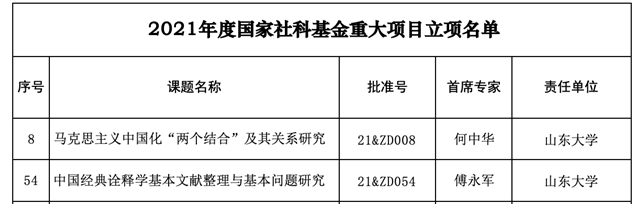 本次获得立项的2项重大项目分别是:何中华教授主持的“马克思主义中国化‘两个结合’及其关系研究”和傅永军教授主持的“中国经典诠释学基本文献整理与基本问题研究”。
