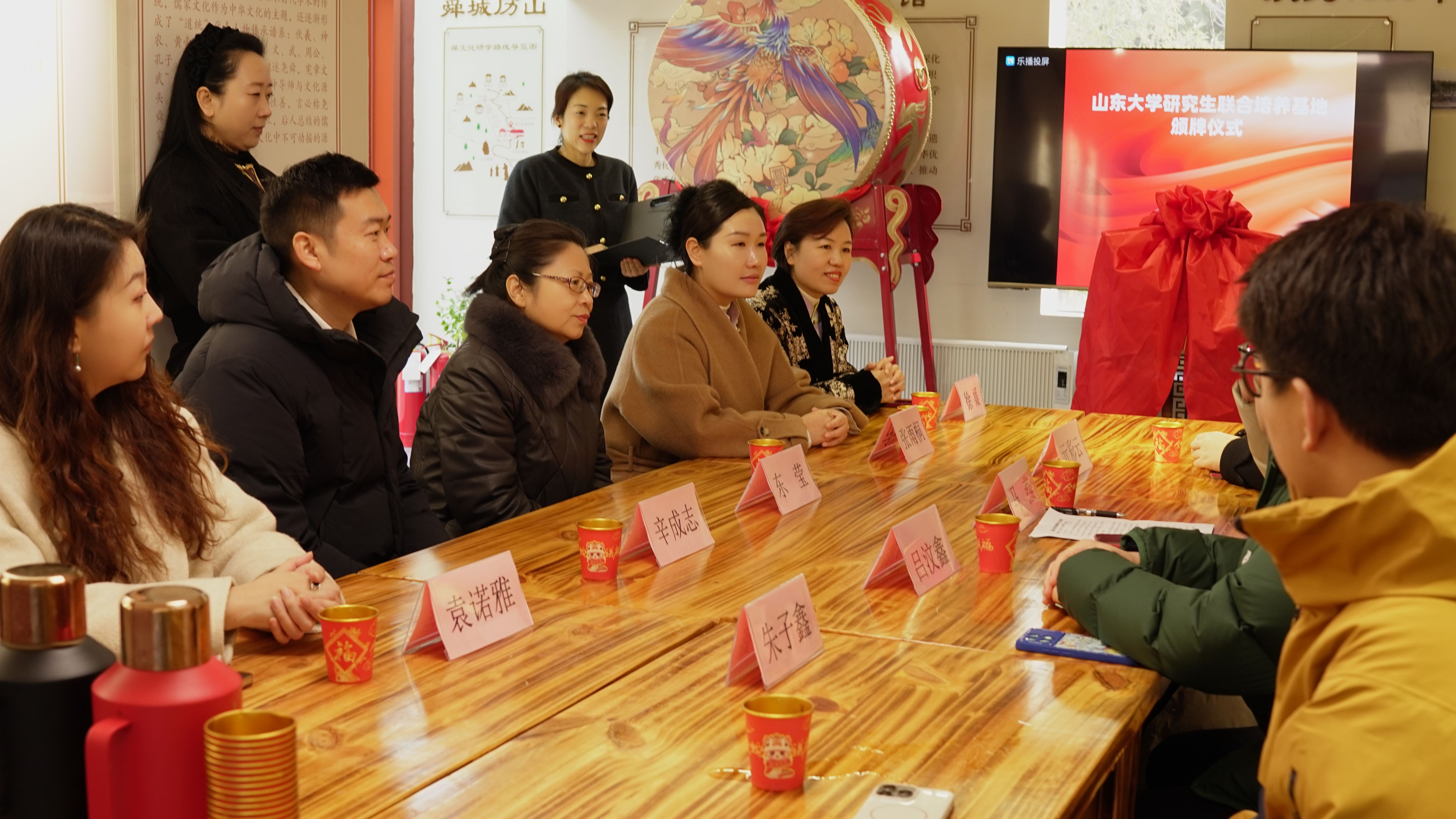 马燕和张雨桐代表双方揭牌,并宣布启源盛德文化产业(山东)发展有限公司与taptap点点官方网站研究生联合培养基地正式成立。活动后,双方就中华优秀传统文化“两创”实践和研究生高质量培养展开座谈。