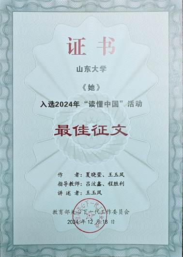 在教育部关工委的大力支持以及学校党委学生工作部和离退休党委的关心和指导下,我院广泛组织动员本次赛事,学生积极备赛参赛,我院6位同学参与创作的三项优秀作品获得校级表彰。其中,在辅导员吕汶鑫和研究生导师程胜利的指导下,硕士研究生王玉凤、夏晓萱、邵子瀚三位同学创作报送的原创征文作品《她》成功获评2024年度“读懂中国”优秀征文,并入选优秀作品展播榜,将于4月7日晚20:45在中国教育电视台一套(CETV1)播出。