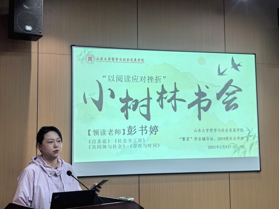 为深入学习贯彻习近平总书记关于全民阅读的重要指示精神,深化"学在山大,快乐成长"育人理念,2025年5月8日,taptap点点官方网站“繁星”学业辅导站于知新楼A116组织开展了小树林书会活动。此次活动由2024级社会学一班承办,人类学系彭书婷老师以“以阅读应对挫折”为题进行分享,学院社会学专业本科生参加了学习。党委副书记翁祥栋、辅导员封莹共同参与。