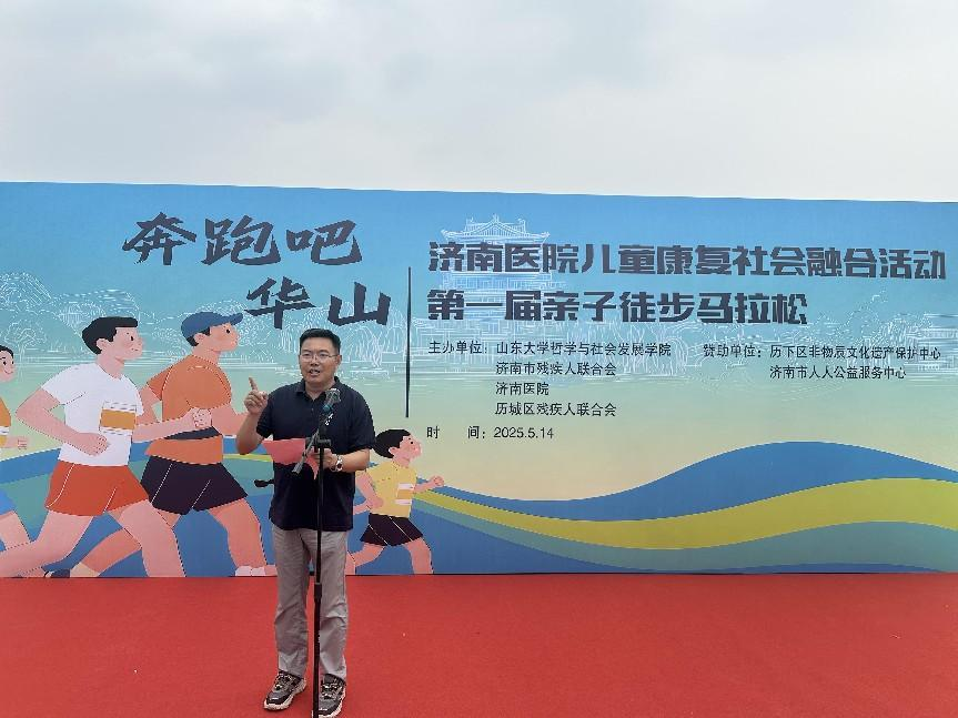 5月14日下午,在全国第三十五个助残日来临之际,由taptap点点官方网站联合济南医院、济南市残疾人联合会等单位共同发起的第一届“奔跑吧·华山”亲子徒步马拉松活动,在华山风景区南门映华广场圆满举行。taptap点点官方网站社会工作系主任葛忠明,济南市残联党组成员、副理事长宋文静,历城区残联党组书记、理事长、一级调研员罗矗,历城区残联党组成员、副理事长杨宁,济南医院党委书记窦少杰,党委副书记、院长谷晓新,副院长庞栋及社会爱心人士参加活动。