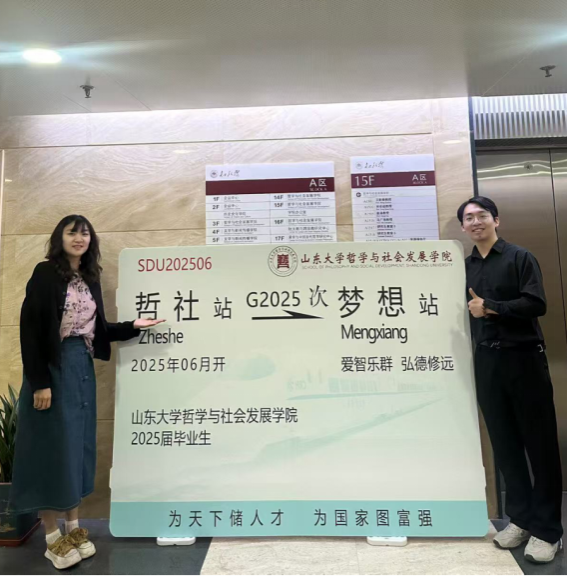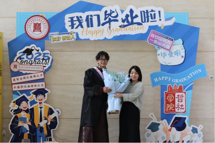 以时光为笺,为留存毕业季的温暖记忆,学院打造“夏风来信”主题系列活动,开展“时光邮局·致未来的我们”毕业回忆征集,构建“影像记录+文化传承+情感共鸣”的三维记忆体系。在知新楼A座设置的创意毕业照打卡点,配备定制学位道具,为毕业生定格仪式感瞬间。图书漂流活动则让知识在传递中延续哲社学子的精神联结。“领航者说”年会环节邀请优秀毕业生参与寄语赠书,分享学生工作经历与生涯规划策略,将个人成长与学院发展紧密相连。现场参与活动的毕业生表示:“这些活动不仅是对大学生活的告别,更是对未来人生的启航,让我们带着山大烙印走向更广阔的天地。”