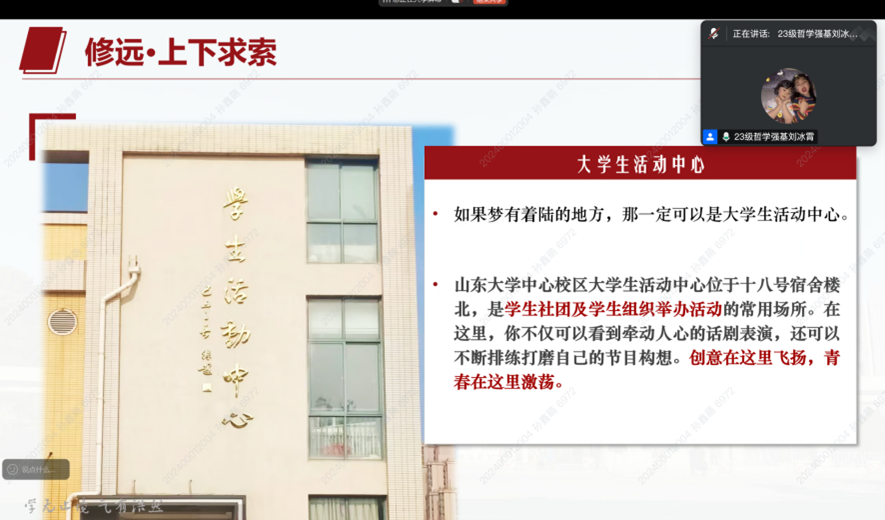2023级哲学强基班刘冰霄以“等风来不如追风去”为核心,建议新生通过任务拆解、区分事务轻重缓急等方式来避免“无效忙碌”。学习上,她推荐从导论类书籍入手,构建知识框架,善用各类学习资源,并强调英语对哲学学习的重要性;针对生涯迷茫问题,她提出“不确定是常态”,建议新生先夯实专业基础、在试错中明确发展方向。此外,此外,刘冰霄以“爱智乐群,弘德修远”院训为指引,详细介绍了中心校区场馆预约、宿舍设施等日常细节,为新生提供“一站式”生活指南。