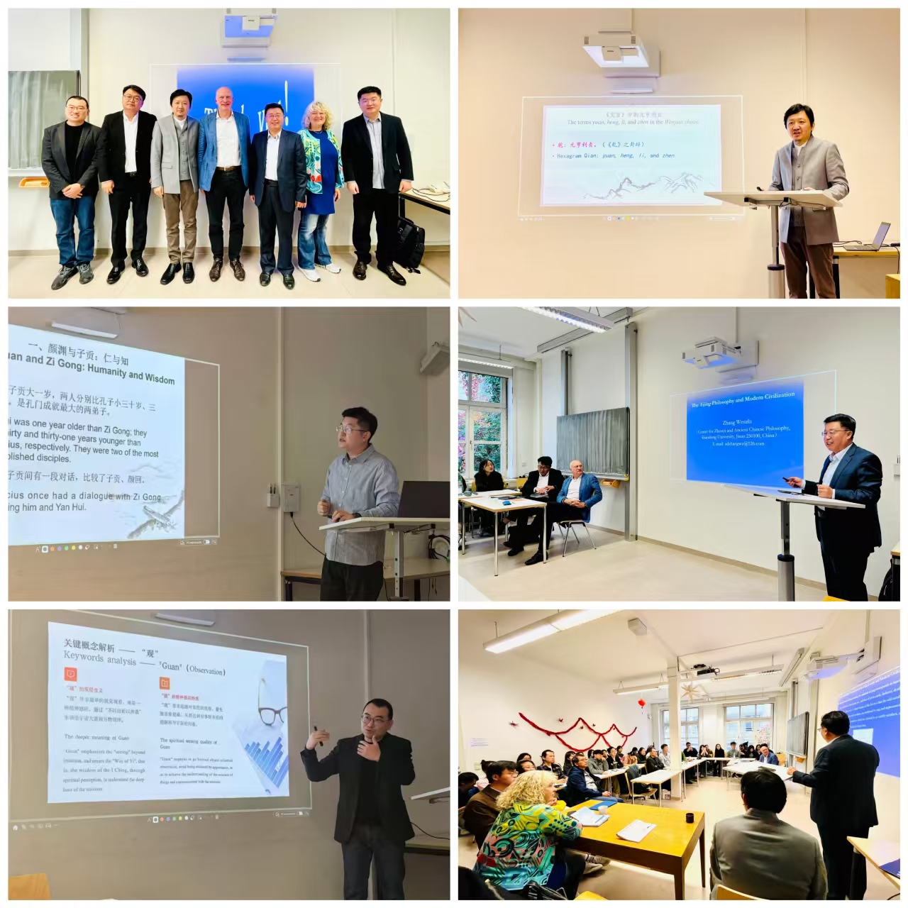 在慕尼黑访问期间,代表团成员为慕尼黑大学汉学系的师生及该校其它系的中国文化爱好者奉献了四场学术讲座。这四场讲座的主题分别是:“从‘元’‘亨’‘利’‘贞’解读《周易》哲学”“《周易》与现代文明”“《周易》象思维的逻辑”以及“《论语》中的孔门弟子形象比较”。讲座由叶翰教授和鲍吾刚教授的弟子Dominique Hertzer教授主持,受到与会学者与学生的一致好评,为双方的进一步交流与合作奠定了基础。此外,代表团还应邀访问了山东省政府驻欧洲经贸代表处,与代表处首席代表于雷、巴伐利亚-山东经贸交流促进会秘书长唐彦、德国山东商会巴伐利亚分会会长张昊等德国商贸界人士进行了深入的交流。代表团向当地华裔社区介绍了学校近年来在文明互鉴和文化传播方面所采取的一系列措施及其成效,并就进一步加强中德文化合作提出了若干建议。