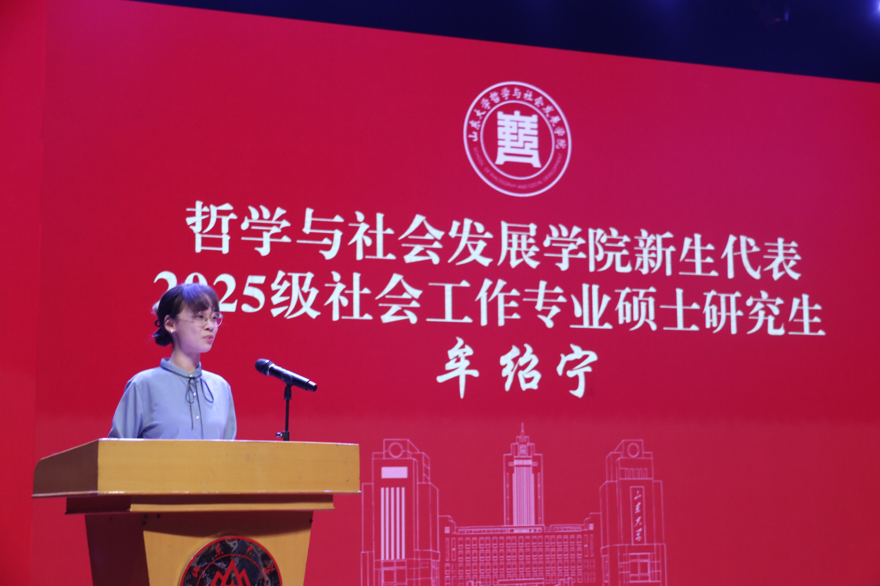 2023级哲学拔尖班本科生孙铭昊作为老生代表发言。他鼓励同学们跳出舒适区、深耕学术,在追问自我中找准方向,守护好自己的主体性和生命的整全,在学校和学院提供的广阔平台中不断提升能力,成长为有担当的山大人。
