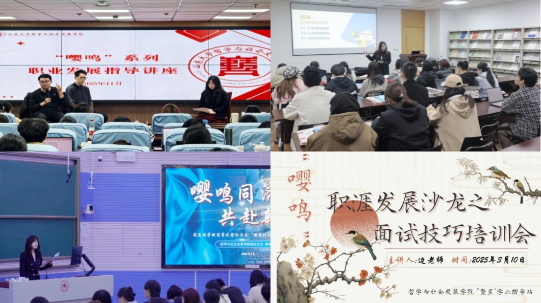 学院持续深耕“嘤鸣”系列生涯发展品牌,整合公职人员、优秀校友、公考培训专家等多方资源,打造覆盖升学就业全流程的专题讲座矩阵。全年累计举办20余场特色活动,从3月山东省选调生备考辅导、11月公务员职业特质解析,到国考省考最新考情解读、跨专业就业经验分享,全方位回应学生核心诉求。针对选调生招录,采用线上线下联动模式,详细拆解定向选调、常规选调的报名条件、选拔程序与发展前景,帮助学生精准把握政策要点;创新推出“嘤鸣蓄力”定制模考活动,全真模拟考场环境与流程,助力学生提前适应考试节奏、科学评估备考水平。考研经验分享会上,优秀毕业生从择校策略、复习规划到复试技巧展开全方位分享,为学弟学妹提供可落地、实用性强的行动指引,让品牌活动成为学生升学就业的“定心丸”。