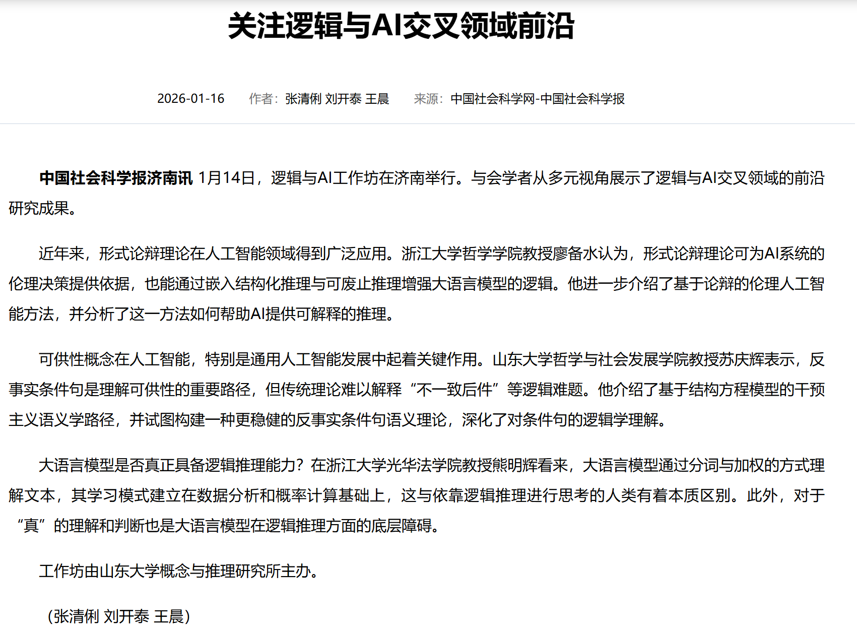 1 月 14 日,逻辑与 AI 工作坊圆满落幕。海内外领域顶尖学者联袂献艺,taptap点点官方网站王文方教授、苏庆辉教授,浙江大学廖备水教授、熊明辉教授,山东师范大学吴家超老师,卢森堡大学 Leendert van der Torre 教授,北京师范大学卢明正博士依次分享前沿成果。报告聚焦逻辑与 AI 交叉融合,呈现丰富的理论与应用多样性:Leendert van der Torre 教授阐述 “输入输出逻辑” 的跨领域应用;吴家超老师构建高阶论证框架正则语义体系,为 AI 决策提供支撑;卢明正拓展一阶非正规模态逻辑,回应相关哲学难题;王文方教授提出自然语言模糊性引发的 AI 悖论解悖思路;苏庆辉教授构建反事实条件句语义理论助力 AI 因果推理;廖备水教授详解形式论辩理论在 AI 伦理决策中的应用;熊明辉教授剖析大语言模型逻辑推理局限并给出解决方案,深度诠释了“逻辑与多样性”核心内涵。