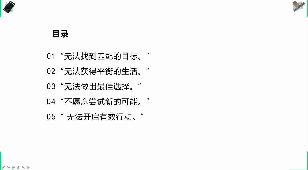 首先,封莹从多个方面,多个角度入手,介绍了关于生涯规划的主要内容及其作用,分析关于当代大学生焦虑与迷茫的原因。
