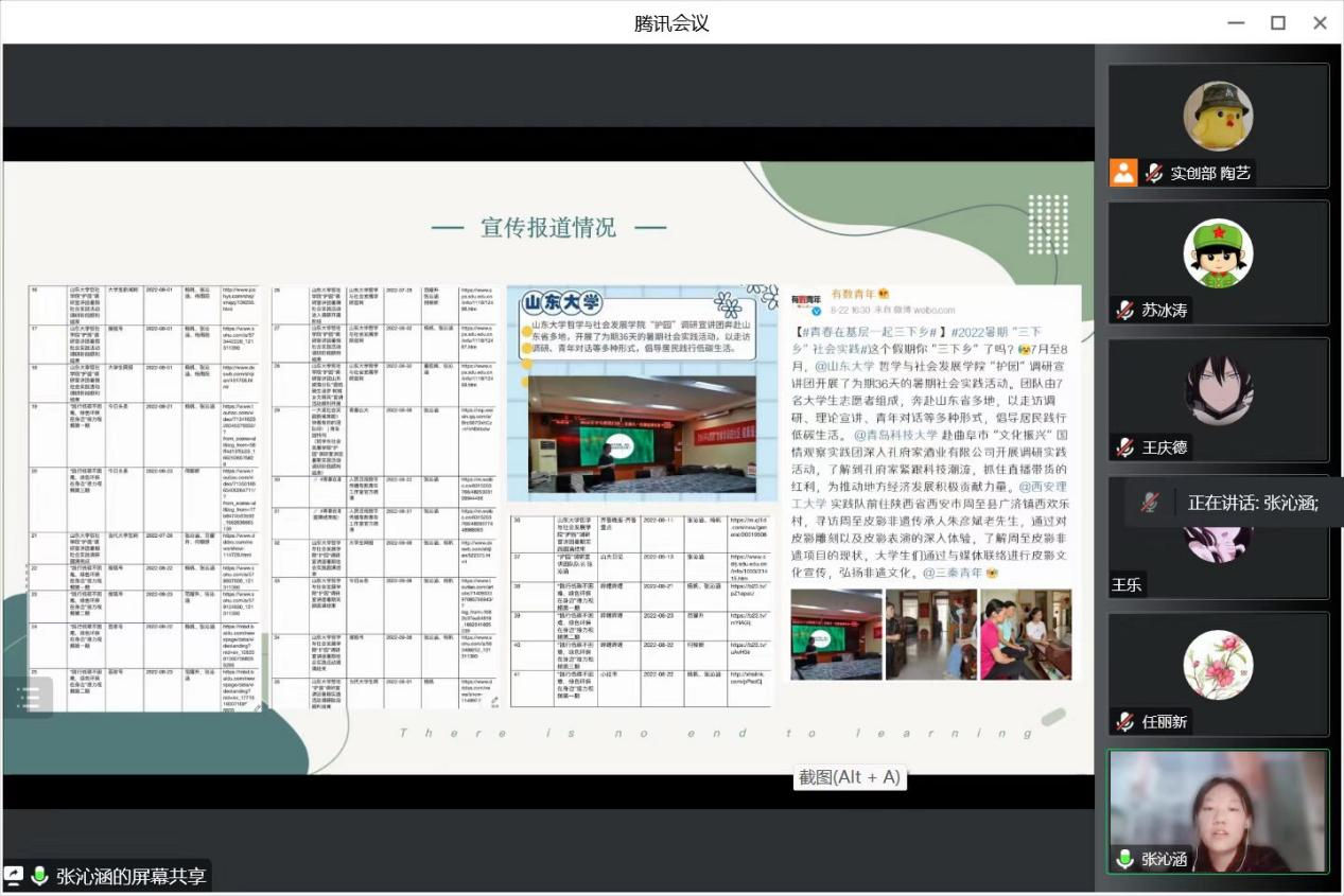 本次结项答辩集中展现了哲社学子在2021-2022学年暑期社会实践中的昂扬风貌,总结实践取得的优秀成果与经验,体现山大学子学而致知,行而致远,在社会实践中充分发挥专业优势,将理论与实践紧密结合,以实际行动迎接党的二十大胜利召开,献礼建团百年。