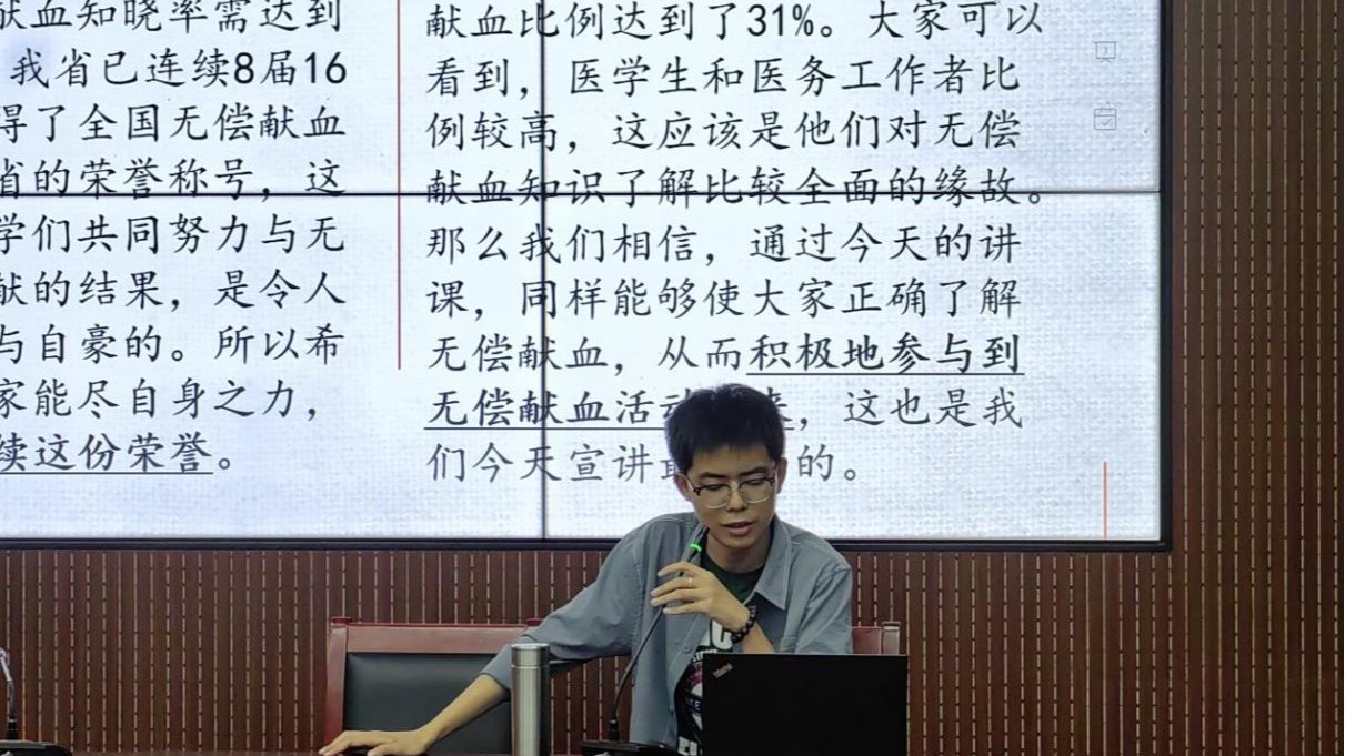 宣讲会结尾,陈劲骁呼吁同学们一起加入无偿献血的队伍,呵护系在血袋上的生命们,伸出双臂,为爱卷袖。