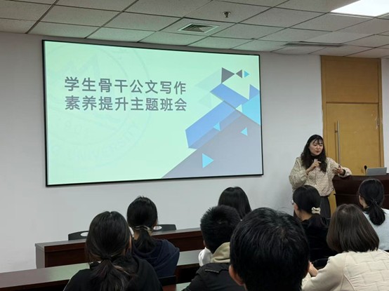 随后,班梦姣为全体与会学生骨干作题为“学生骨干公文素养提升”的主题班会培训。班梦姣从学生工作的实际需求出发,系统讲解了常见学生工作公文(如通知、请示、新闻稿等)的格式规范、写作要点与注意事项。她通过实例分析,深入浅出地阐述了如何使公文写作更加规范、准确、高效,从而更好地服务于班级建设和学院学生工作。
