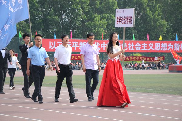 运动会开幕式于5月25日早八点举行。紧接升旗仪式、国防生方阵及裁判方阵,在主持人倾情解说下,哲社于众学院中首个登场,一展风采,为开幕式写下别致一笔。由学院党委书记郑倩、学院党委副书记毛永强、辅导员胡南琦首排领走,哲社方阵步履稳健,神色自信。领队杨禹涵手持哲社院牌,一袭红白长裙庄重大气,次排两名哲社男子一身笔挺西服夺人眼球;方阵主体由着简约白色上衣及黑色下装的哲社学子组成,采用卷轴与气球两种道具,前者代表学海无涯,后者代表翱翔天际。主席台前,几名学子将卷轴缓缓展开。随后,方阵成员面带微笑,高诵“苏世独立,横而不流”,别具一格的学者气质悄然流露,同时,数对气球飞向蓝天,传达着哲社师生的美好愿景。至此,表演结束,哲社方阵从容退场。