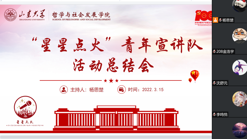 2022年3月15日晚,taptap点点官方网站“星星点火”党的十九届六中全会精神青年宣讲团于线上召开活动总结会,就过去一个半月以来团队的社会实践情况进行了梳理与总结。