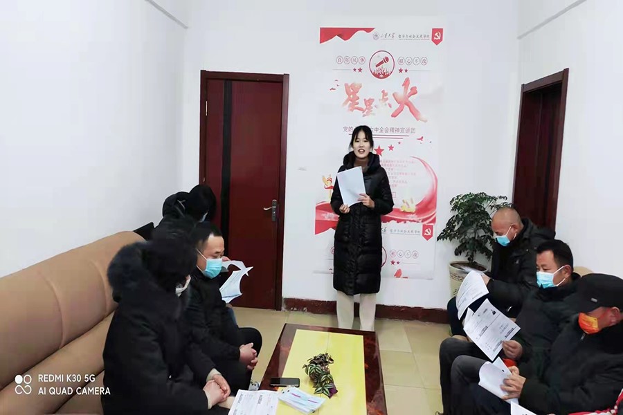在山东淄博,团队成员郭栩彤对桓台县唐二村进行了探访。年关将至,在疫情防控允许的范围内,郭栩彤深入百姓家,于村民中开展了“聊天式”宣讲,讲述过去一年中党和国家各项事业向百姓人民交出的优异答卷,对党的十九届六中全会精神进行生动解读。